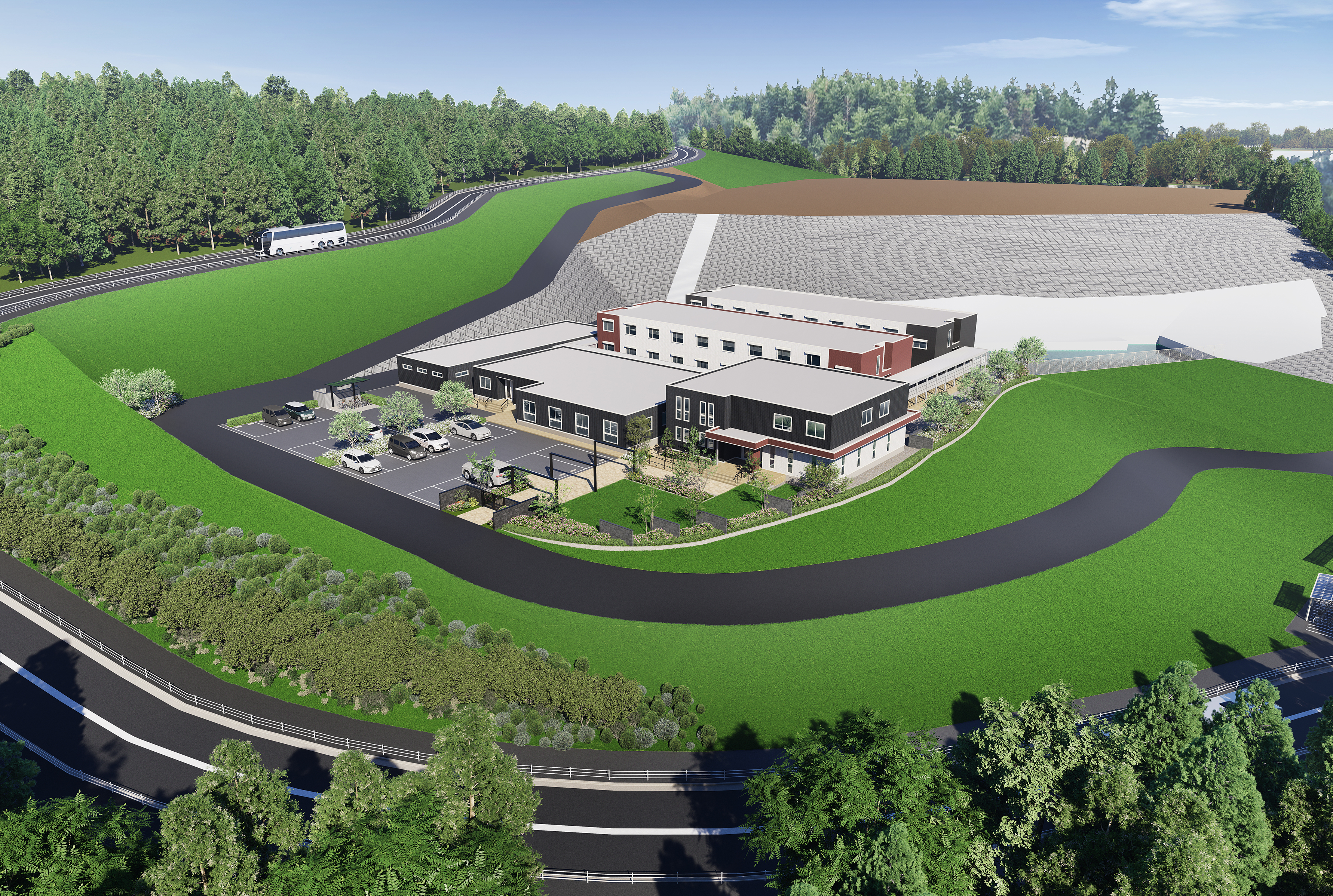 広がる山々や豊かな植栽に囲まれた環境の中で、建物が持つ落ち着きと存在感を表現しました。